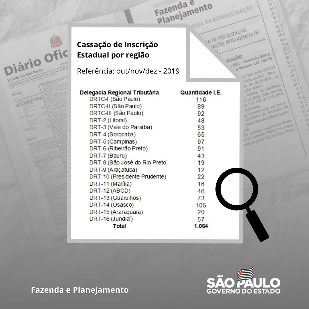 A Secretaria da Fazenda cassou a inscrição estadual de 1.064 contribuintes paulistas do Imposto sobre a Circulação de Mercadorias e Serviços (ICMS) por inatividade presumida. As notificações foram publicadas no Diário Oficial do Estado desta terça-feira (7) e a relação dos contribuintes cassados pode ser consultada na página do Cadesp, clicando em Mais informações > Cassação.