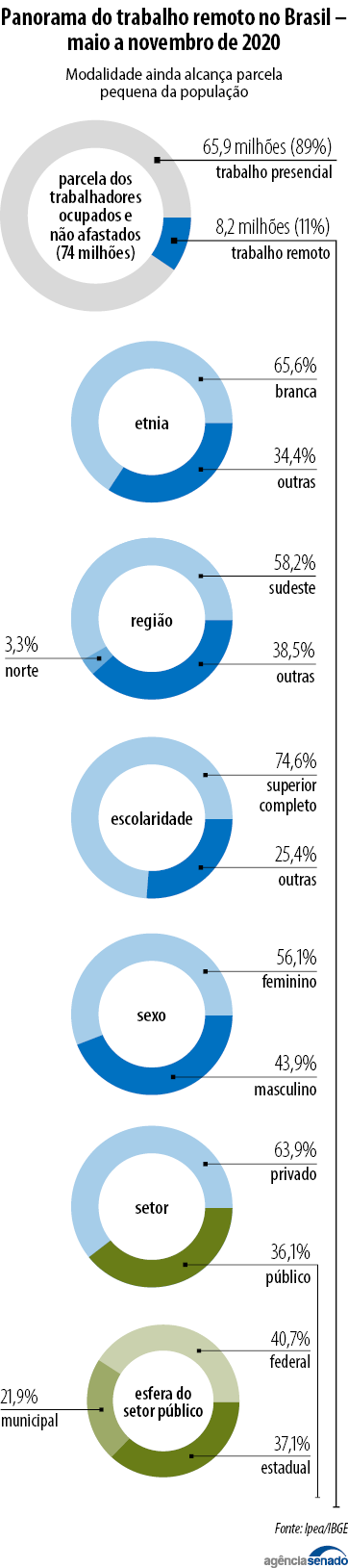 Levantamento do Instituto de Pesquisa Econômica Aplicada (Ipea), feito a partir de dados do Instituto Brasileiro de Geografia e Estatística (IBGE), indica que 11% das pessoas ocupadas e não afastadas exerceram suas atividades remotamente entre maio e novembro de 2020. Em termos absolutos, isso significa que, entre aproximadamente 74 milhões de brasileiros, cerca de 8,2 milhões exerceram o teletrabalho e em torno de 65,9 milhões (89%), o presencial.