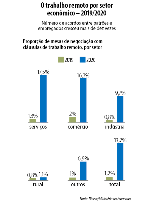 Assistiu-se, portanto, ao crescimento do expediente a distância — o teletrabalho —, e a maior parte dos que nunca o haviam experimentado tiveram de improvisar escritórios em casa. Segundo o Departamento Intersindical de Estatística e Estudos Socioeconômicos (Dieese), o número de negociações trabalhistas com previsão de trabalho remoto cresceu de 284 para 2.738 entre 2019 e 2020. Em termos percentuais, a proporção passou de 1,2% das negociações para 13,7%, mesmo com a diminuição do número de negociações.
